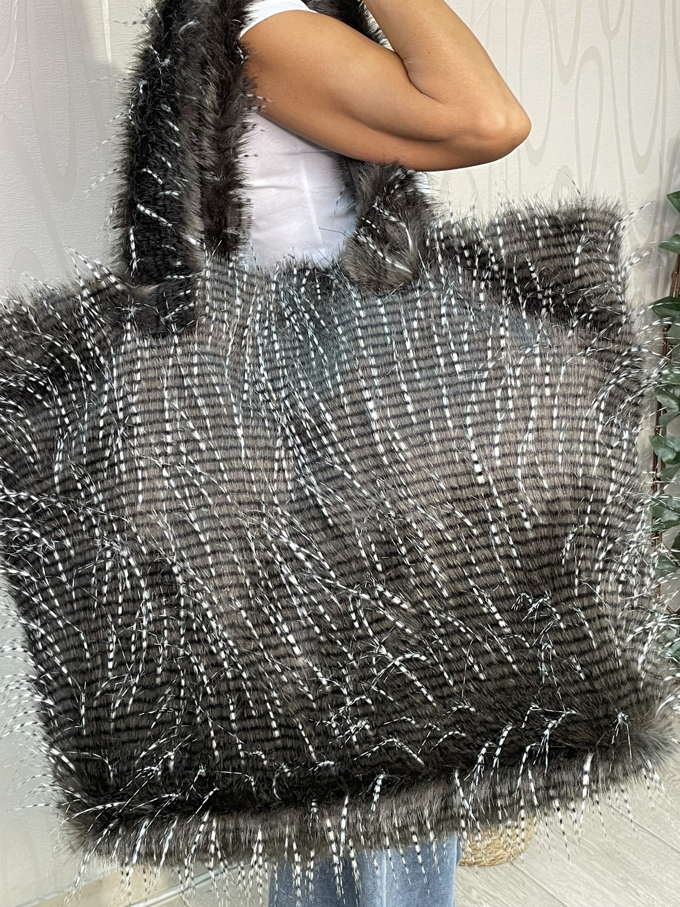 Η γυναικεία τσάντα Lumina ξεχωρίζει για τη μοναδική της γούνινη υφή και το εντυπωσιακό σχέδιο σε μαύρο/γκρι με λευκές λεπτομέρειες. Μία ευρύχωρη tote bag που συνδυάζει στυλ και πρακτικότητα, με φαρδιά χερούλια για άνετη εφαρμογή στον ώμο. Η ιδανική statement επιλογή που θα αναβαθμίσει τις εμφανίσεις σας. Από 130€ τώρα μόνο 65,90€.