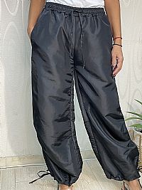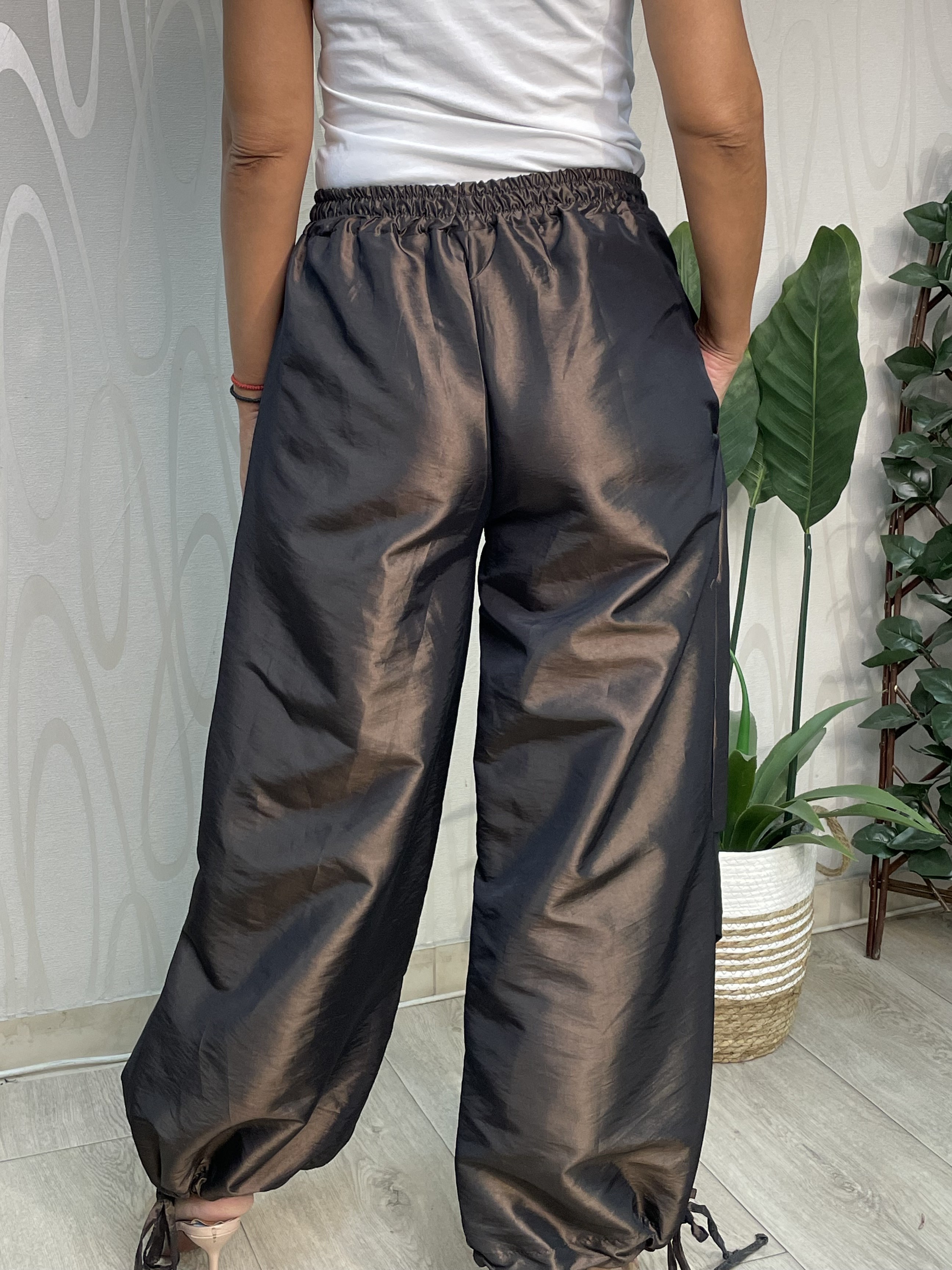Γυναικείο παντελόνι σε ιδιαίτερο μεταλλιζέ ύφασμα, με λάστιχο στη μέση και ρυθμιζόμενο κορδόνι για τέλεια εφαρμογή. Διαθέτει λάστιχο και στο κάτω μέρος, δίνοντας μοντέρνο σπορτίβ chic χαρακτήρα. Καλύπτει έως 110 εκ. μέση και 130 εκ. περιφέρεια. Από 60€ τώρα μόνο 27€.