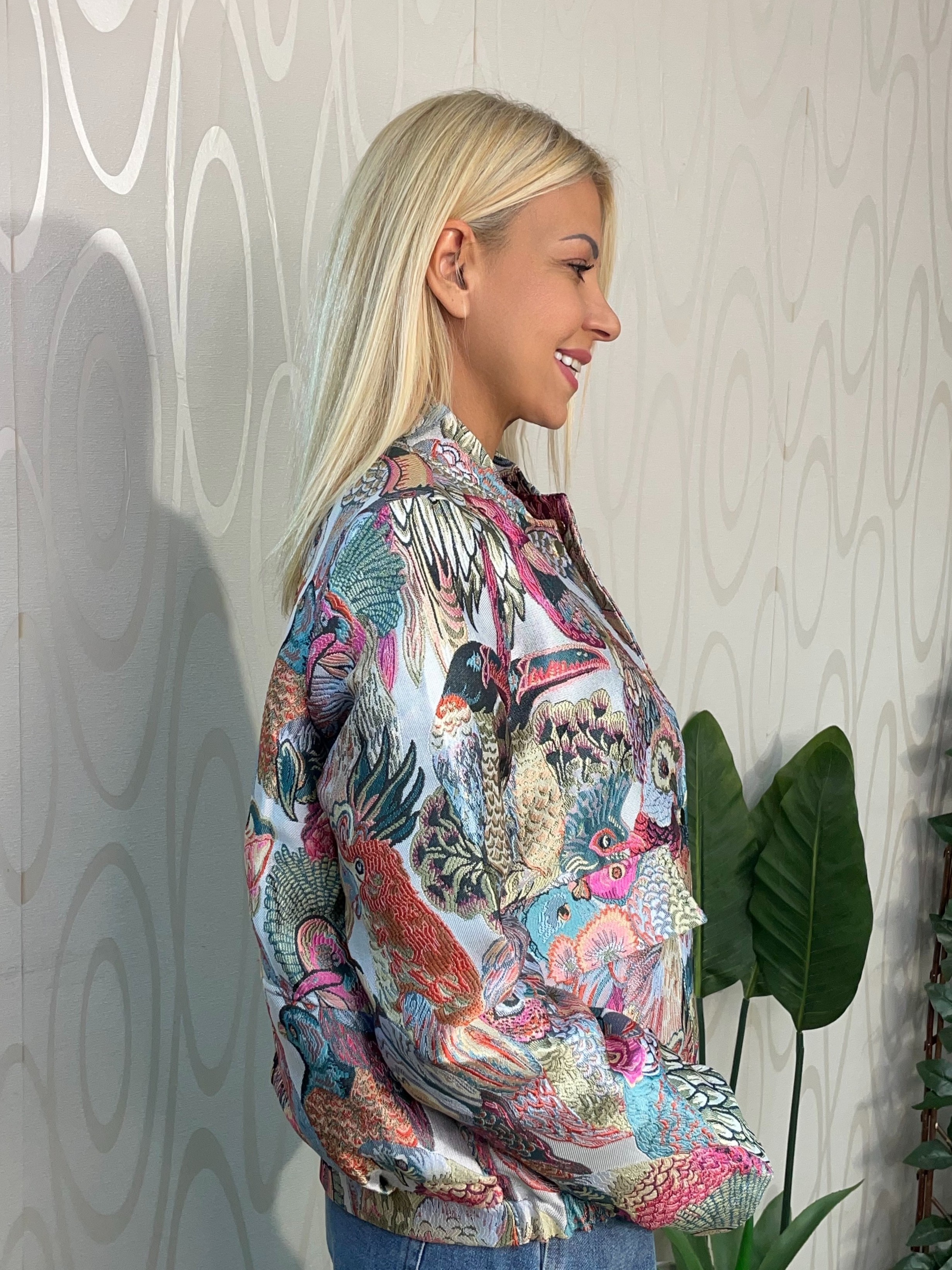 Ανανεώστε το στυλ σας με αυτό το μοναδικό γυναικείο μπουφάν με κοντή γραμμή και πολύχρωμο κεντημένο μοτίβο παπαγάλων. Διαθέτει πρακτικές τσέπες, κουμπώνει μπροστά και ξεχωρίζει για τον εντυπωσιακό του σχεδιασμό που δίνει ένταση σε κάθε εμφάνιση. Ιδανικό για stylish και urban outfits. Από 89,90€ τώρα μόνο 69,90€.